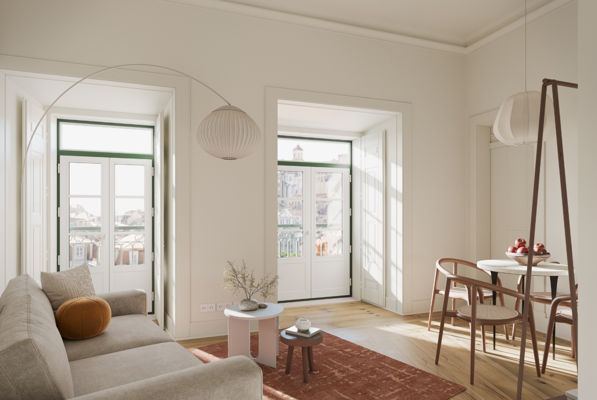 1 Bedroom apartment, new, with 47 sqm (gross floor area), at the Rocio Salema Courtyard project, in Praça do Rossio, Lisbon. The Rocio – Salema Courtyard, a building comprising 36 studio, 1-bedroom, 1-bedroom duplex and 2-bedroom duplex apartments, is located next to one of the most iconic squares in Lisbon, Praça do Rossio.This corner of Lisbon that marvels people from all over the world represents in a perfect manner the intersection between heritage and modernity, which results in a picturesque and welcoming space in the centre of the hustle and bustle of the city. Despite being a rehabilitated building, the Rocio – Salema Courtyard has kept its typical Lisbon structure and the original three storeys, overlooking the river. The Rocio is the ideal address for those wanting to live or invest in one of the most vibrant cities due to the constant tourism growth. The development is near important monuments of the metropolis, such as the statue of D. Pedro IV, the Teatro D. Maria II and the Coliseu dos Recreios. Next to Praça do Rossio, the building has a privileged location in terms of transport, at a short distance from the underground, bus and the Rossio train station. This is the perfect opportunity for those wanting to be where the action is while having a luxurious haven to call home.