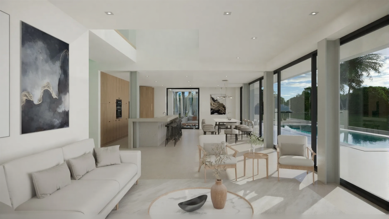 This area has large windows with sliding doors leading out onto the private terrace where you´ll find a swimming pool, seating areas and gardens.