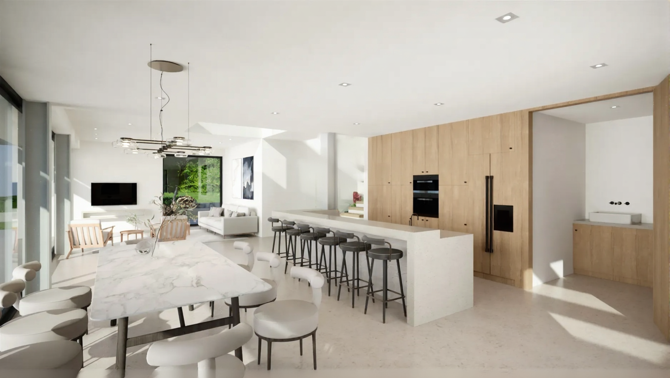 The ground floor has an open-plan living room, dining area and state-of-the-art kitchen equipped with modern integrated appliances and a large breakfast bar.