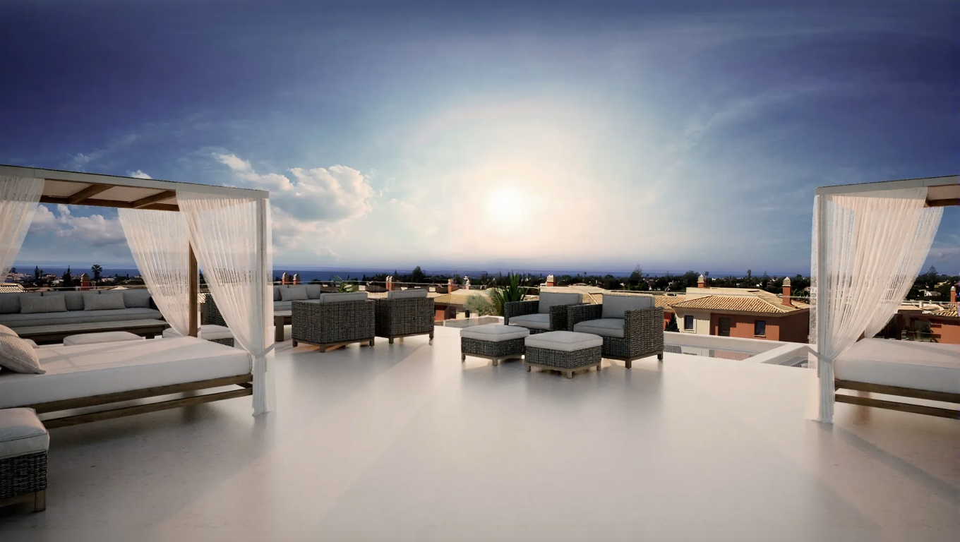 On the upper floor there are two more bedrooms, also en suite, with fitted wardrobes and access to private terraces. All bathrooms have electric underfloor heating.