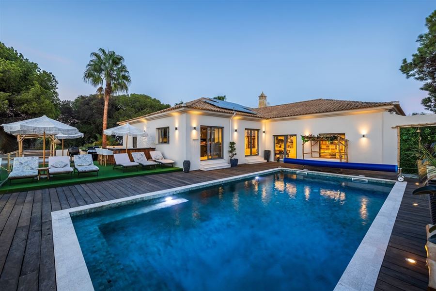 This six bedroom villa for sale is nestled in a tranquil area of Almancil, within a short distance from the city centre and a wide array of golden beaches. With meticulously designed features, this property is the epitome of elegance and modern comfort.Upon entrance, you’ll be greeted by an inviting entry hall that leads to a spacious living room, a sophisticated dining area, and a fully fitted kitchen equipped with AEG appliances. With six generously proportioned bedrooms and modern bathrooms, this villa offers luxurious living spaces tailored for utmost comfort. Additionally, indulge in entertainment within the games room, complete with a pool table, a bar and lounge area, ideal for hosting gatherings with friends and family.Externally, the villa offers expansive terraces, a covered area featuring a dining and lounge space, a designated BBQ area, a large heated saltwater pool, and beautifully landscaped gardens.Additional features include:air conditioning, solar photovoltaic panels, electric fireplace, teak wood flooring, heated towel rails, private parking and more.Boasting a prime location just five minutes away from the prestigious areas of Vale do Lobo and Quinta do Lago, this villa enjoys easy access to pristine beaches, world-class golf courses, and a wide range of luxury amenities. Families seeking top-tier education for their children will appreciate the proximity to the renowned Nobel International School, enhancing the villa’s appeal as the ideal choice. Faro International Airport is only a 30 minute drive away from the property.