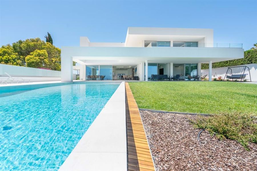 This stunning five bedroom villa for sale is located in a quiet residential area of Lagos, within a short drive away from the city centre and an array of golden beaches. Recently built, this residence is the epitome of luxury, with its contemporary design and breathtaking sea and mountain views.Spread across two floors, this villa comprises on the ground floor a welcoming entry hall, leading to a spacious living room in open plan with a dining area and a fully equipped kitchen. The kitchen features a modern island and connects seamlessly with a convenient utility area. This floor still offers a bedroom with an en-suite bathroom and a versatile room currently being used as a cinema room, but could easily serve as an additional bedroom. Upstairs, you’ll find three large bedrooms, each boasting their own en-suite bathroom, and private terraces offering amazing views.Externally, this property offers a large swimming pool, complete with sunbeds and shower area, an ample terrace with a dedicated BBQ and dining area, and beautifully landscaped gardens all around the property.Additional features include:air conditioning, underfloor heating, double glazed windows, fireplace, electric shutters, fitted wardrobes, solar panels, security alarm, air renewal system, laundry room and private parking.Boasting prime location and breathtaking sea views, this property is situated just a couple minutes away from all necessary amenities, including restaurants, supermarkets, bars, cafes, etc. Within a short scenic drive, you will find a wide array of stunning golden beaches, such as Meia Praia, Praia Dona Ana, Praia do Camilo, and much more.